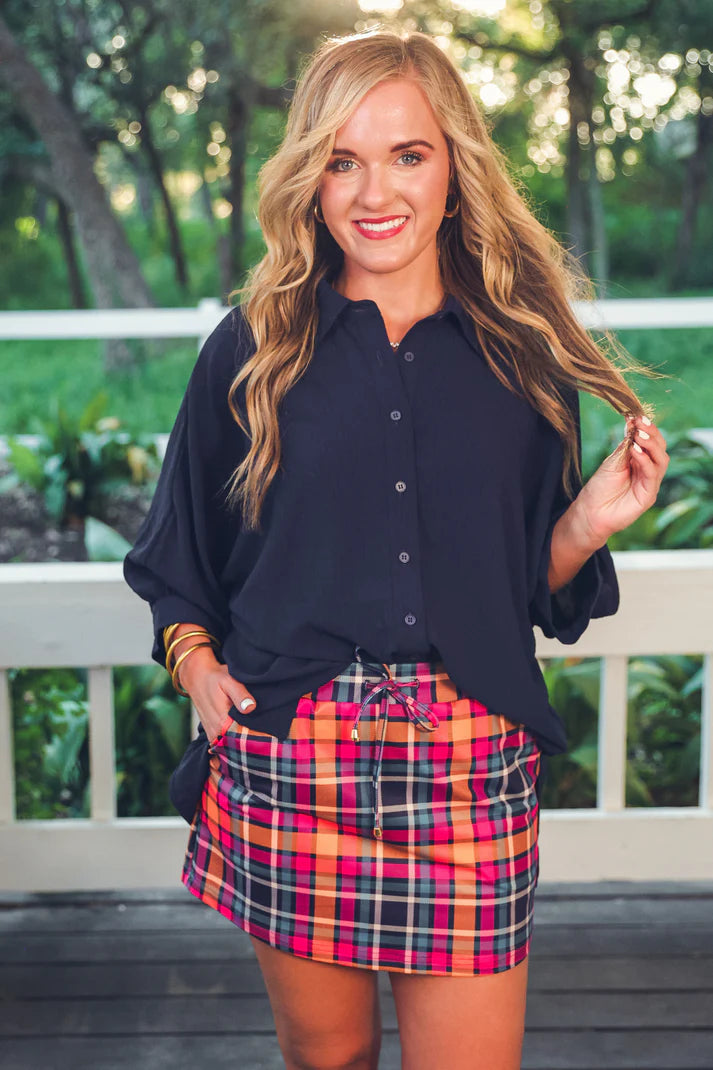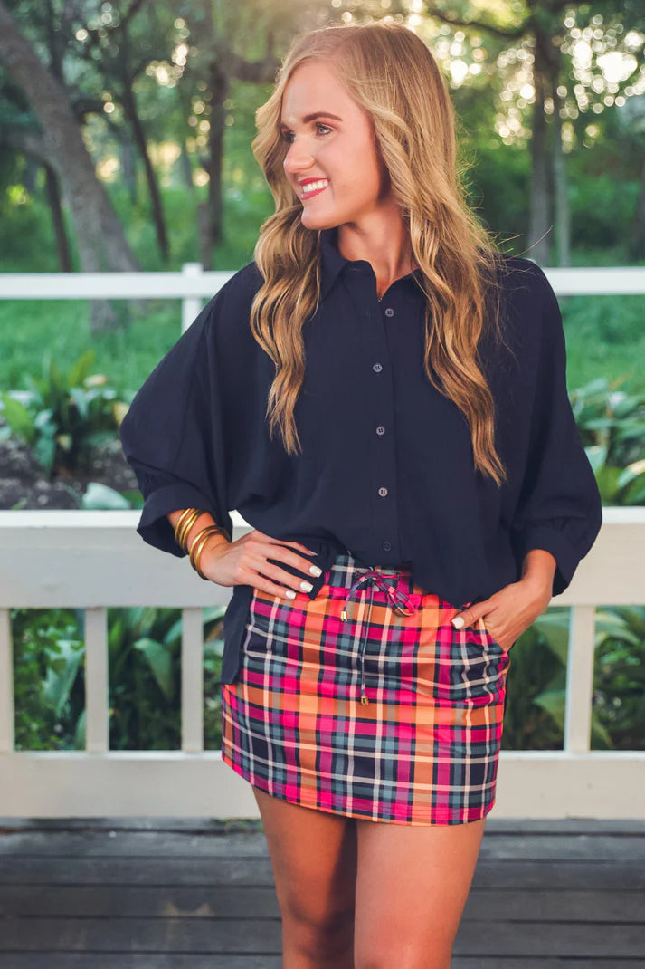 Infused with coastal charm and vibrant color, the Patterned in Plaid Skort is made for sunlit strolls, seaside escapes, and everyday adventures. Featuring a bold plaid print in navy, orange, and pink, this playful piece blends classic pattern with a modern, sporty silhouette. The elastic waistband and adjustable drawstring offer a comfortable, stay-put fit, while built-in shorts and side pockets keep things effortlessly functional. With its soft, stretchy fabric and eye-catching design, this skort is your year-round statement piece—equally stunning with a simple tee or layered up with a denim jacket on breezy days.