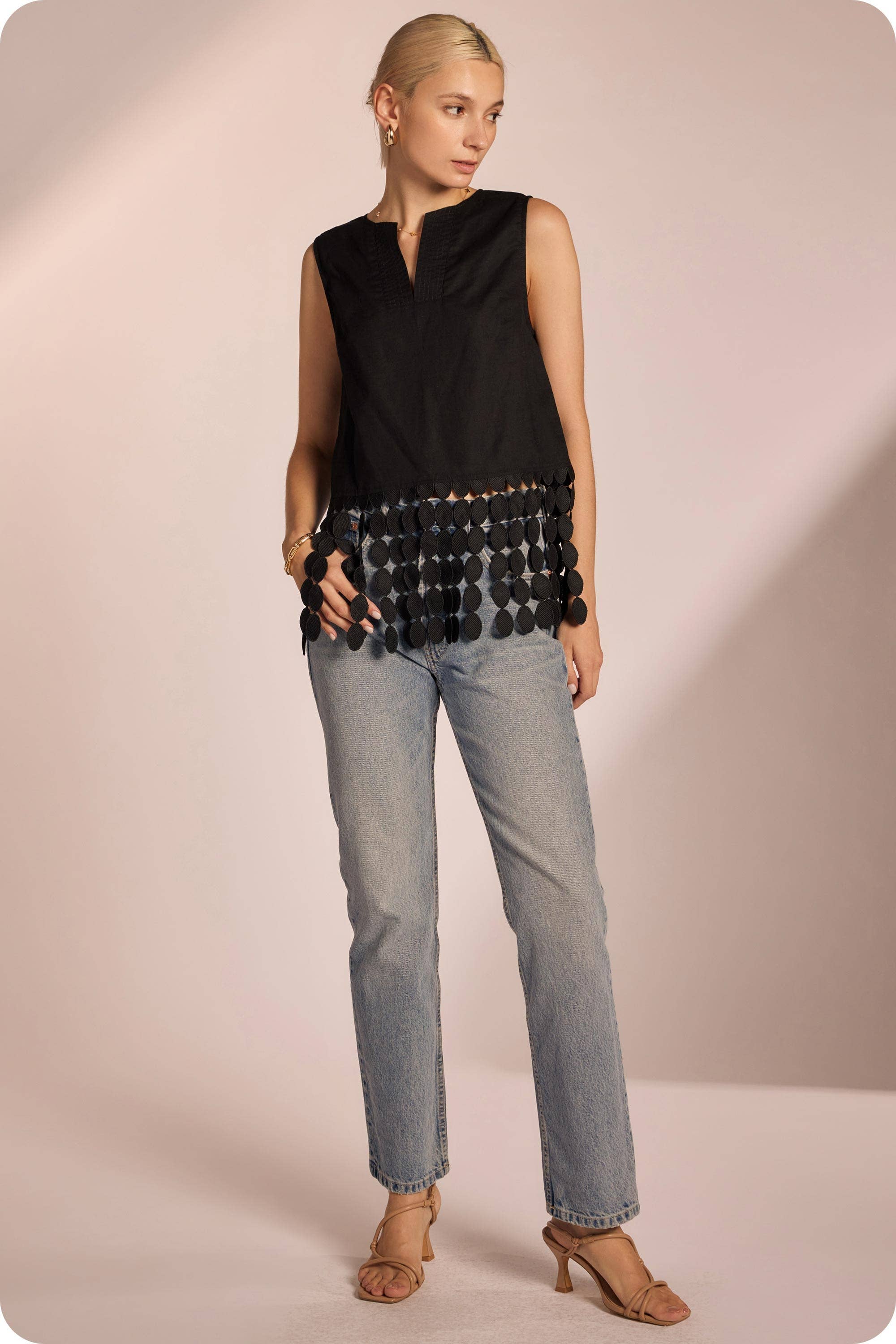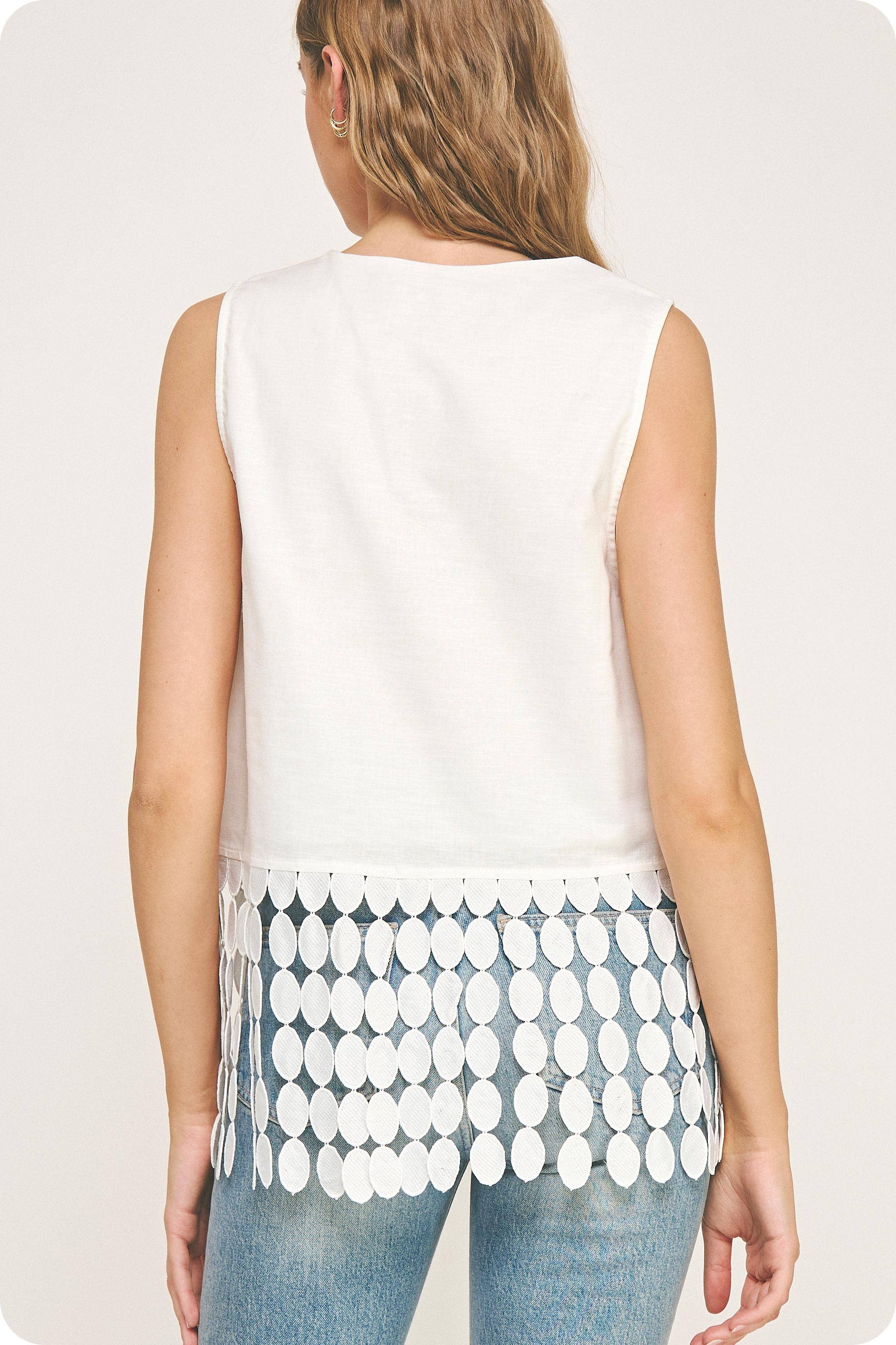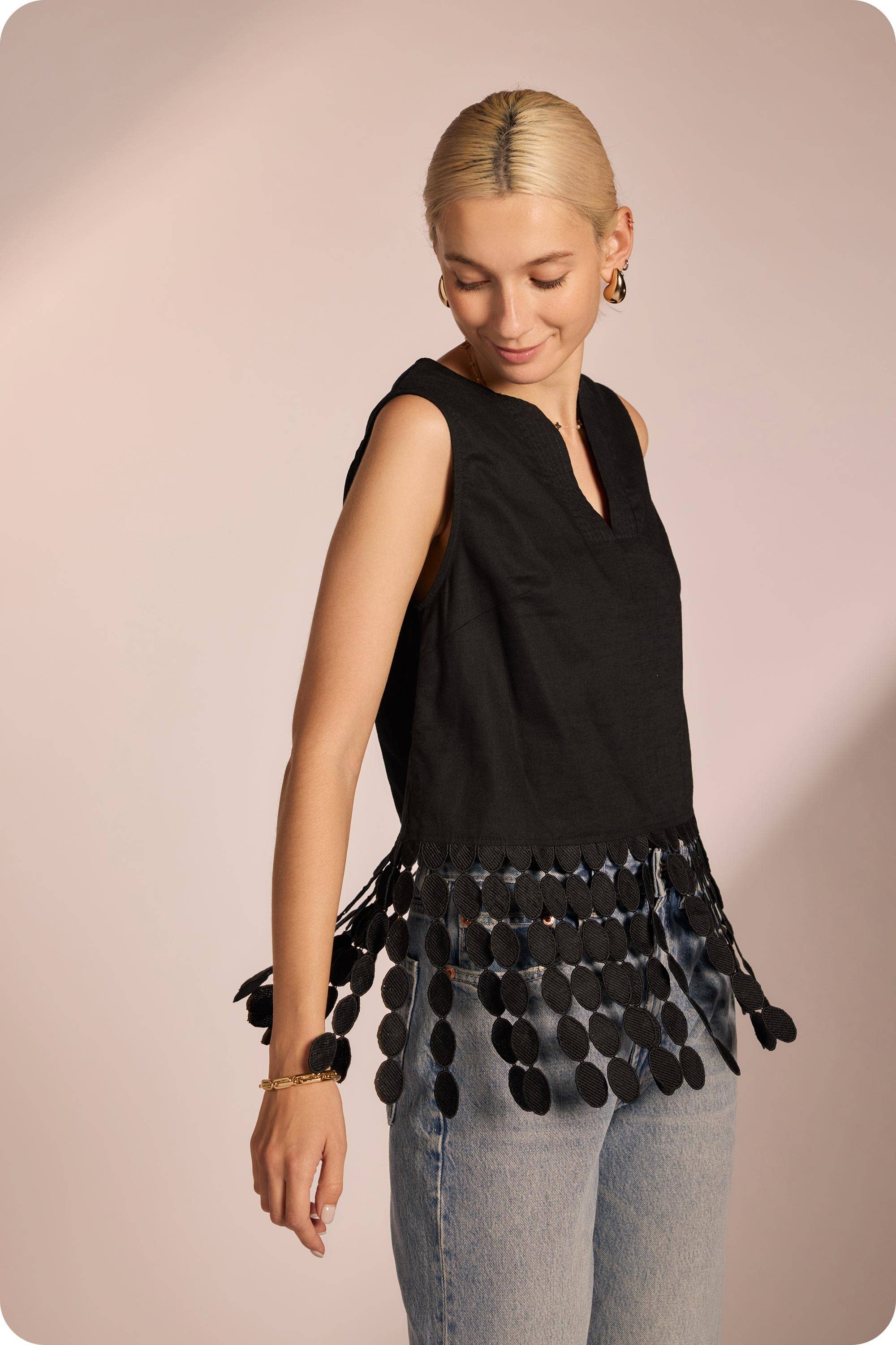 Effortlessly elegant and undeniably coastal, our Dotted Lace Fringe Linen Top blends relaxed sophistication with breezy charm. Available in classic black and soft off-white, this sleeveless tank is crafted from a breathable linen-cotton blend for ultimate comfort. The split V-neckline with topstitch detail adds a refined touch, while the delicate polka dot fringe lace trim at the hem brings a playful, feminine finish. Whether you’re strolling the shoreline or styling it for sunset cocktails, this top is a timeless staple with a chic coastal twist.