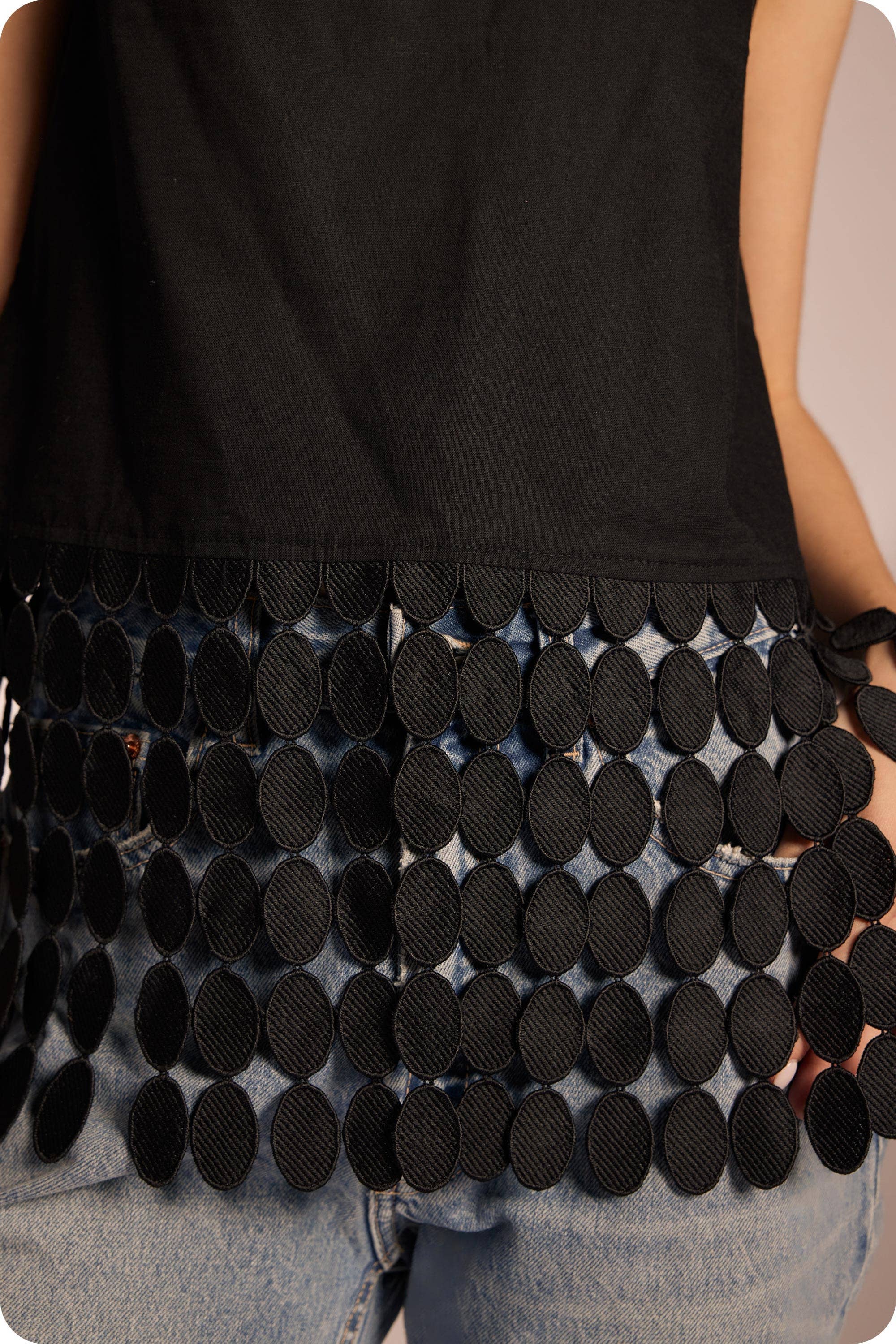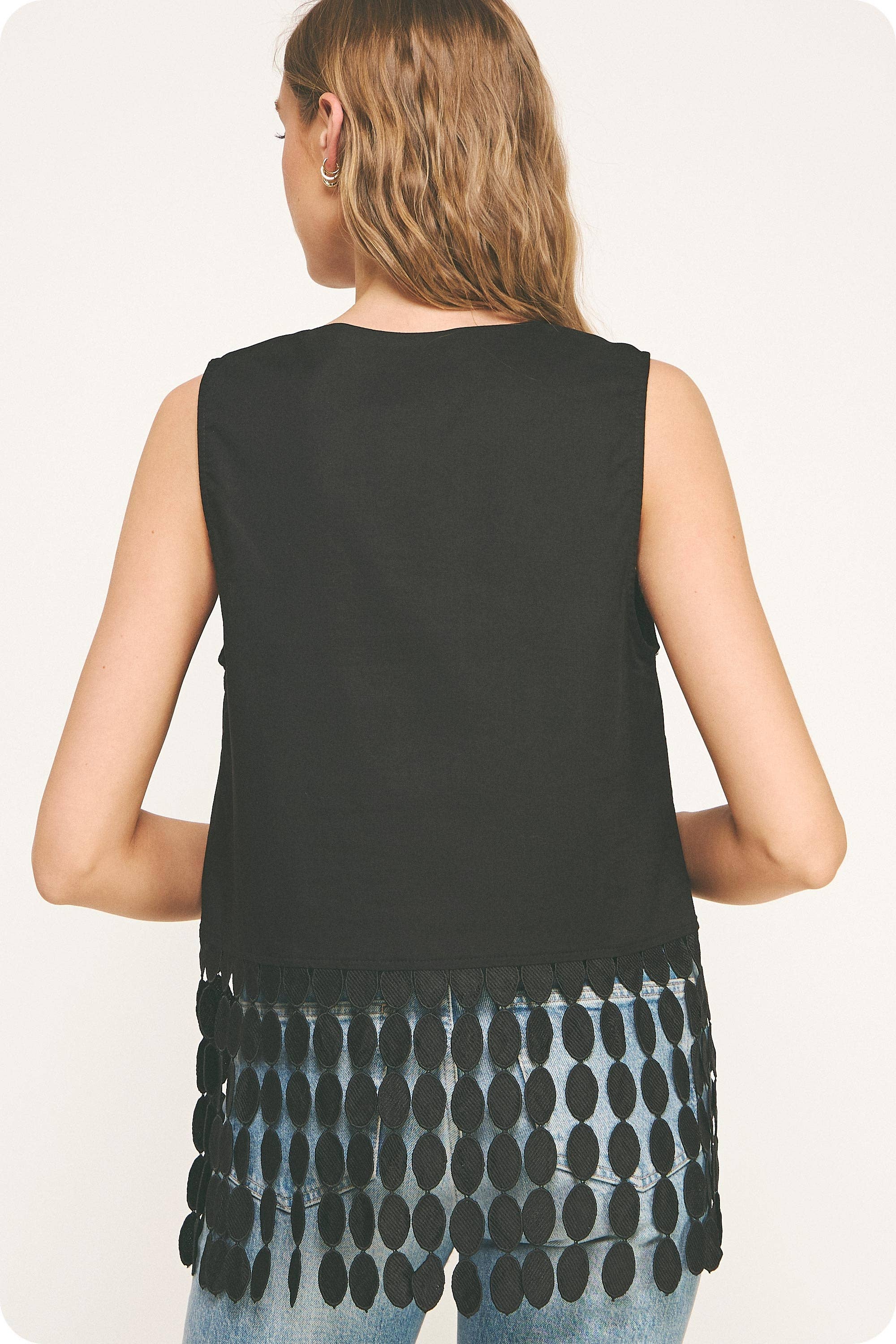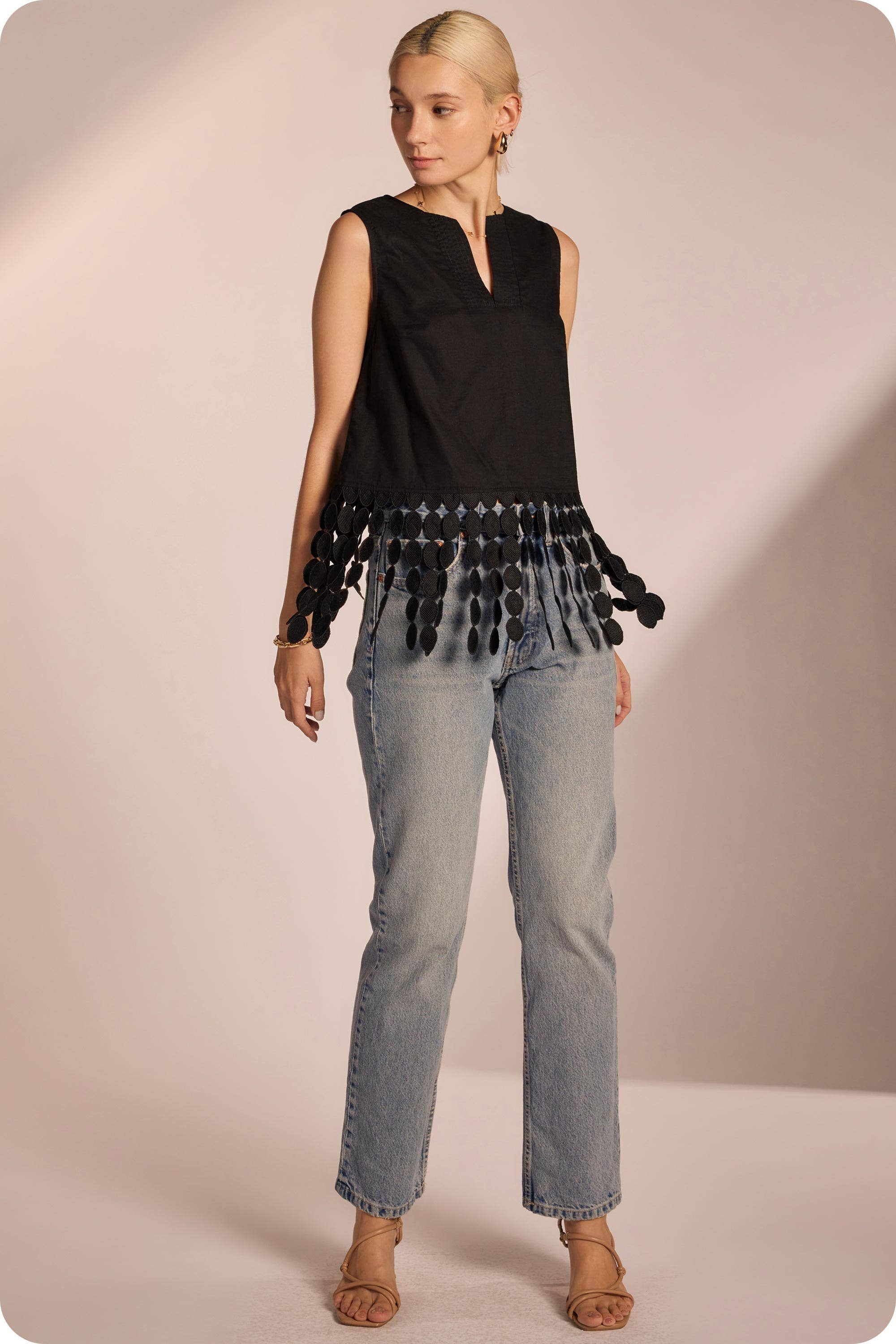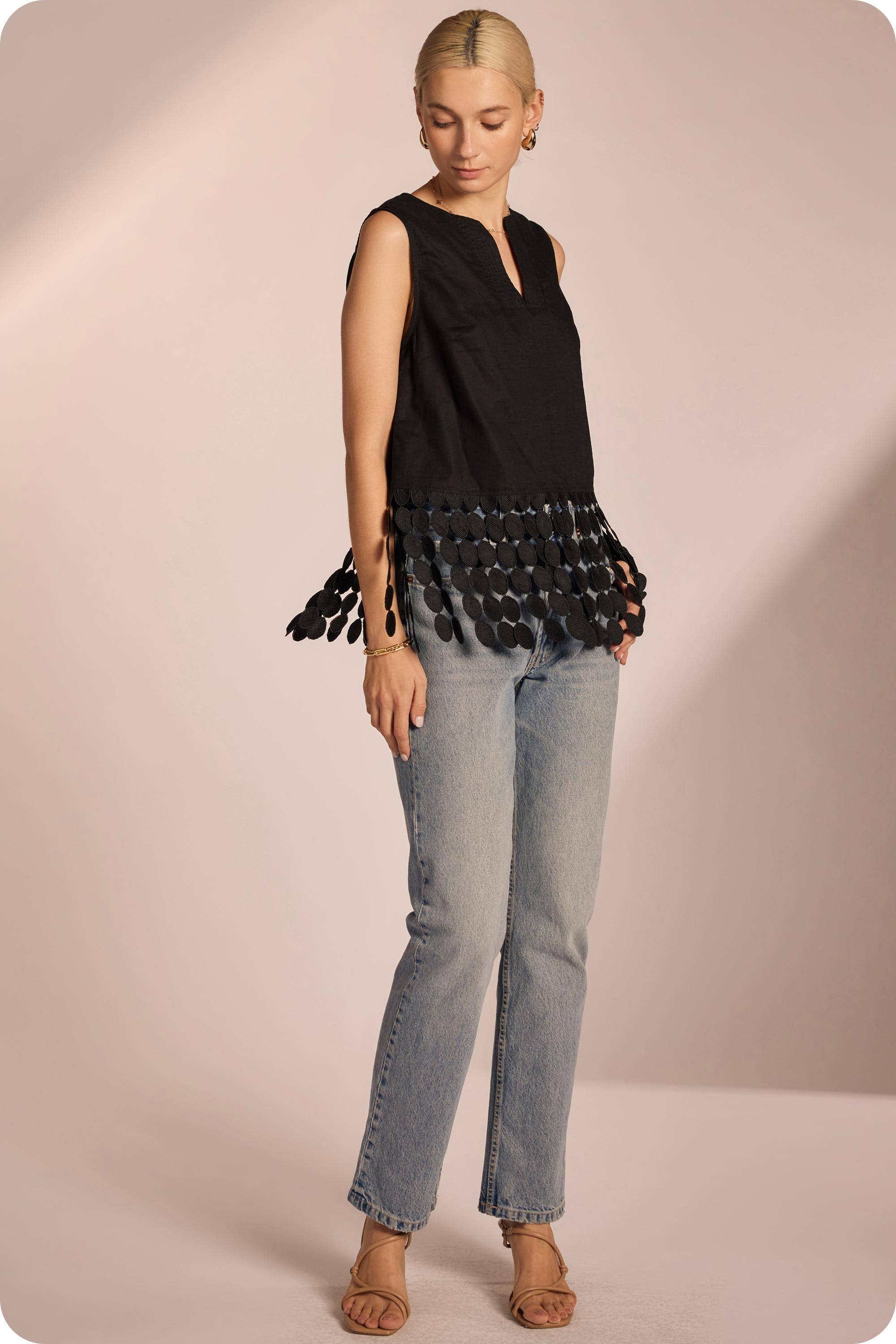 Effortlessly elegant and undeniably coastal, our Dotted Lace Fringe Linen Top blends relaxed sophistication with breezy charm. Available in classic black and soft off-white, this sleeveless tank is crafted from a breathable linen-cotton blend for ultimate comfort. The split V-neckline with topstitch detail adds a refined touch, while the delicate polka dot fringe lace trim at the hem brings a playful, feminine finish. Whether you’re strolling the shoreline or styling it for sunset cocktails, this top is a timeless staple with a chic coastal twist.