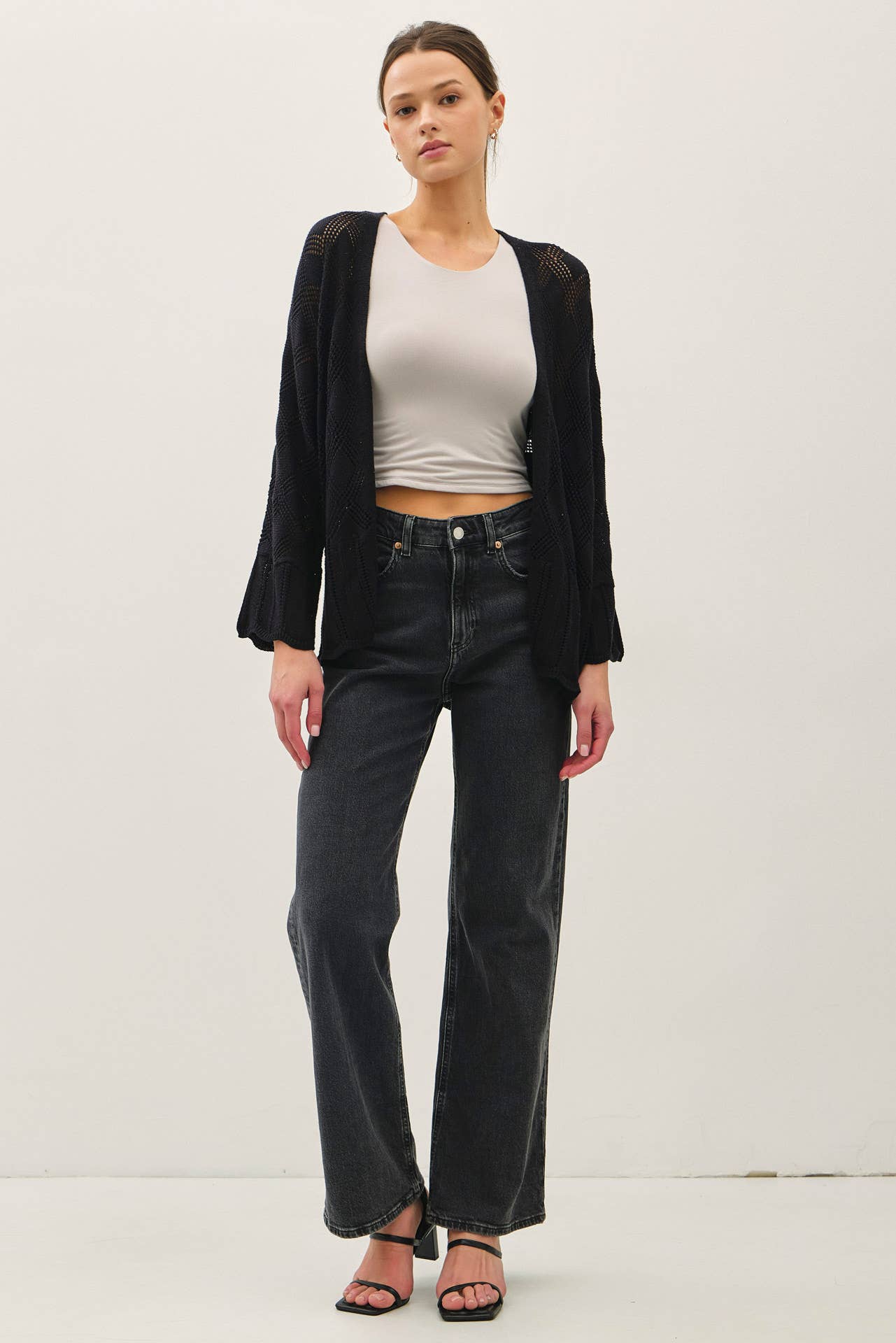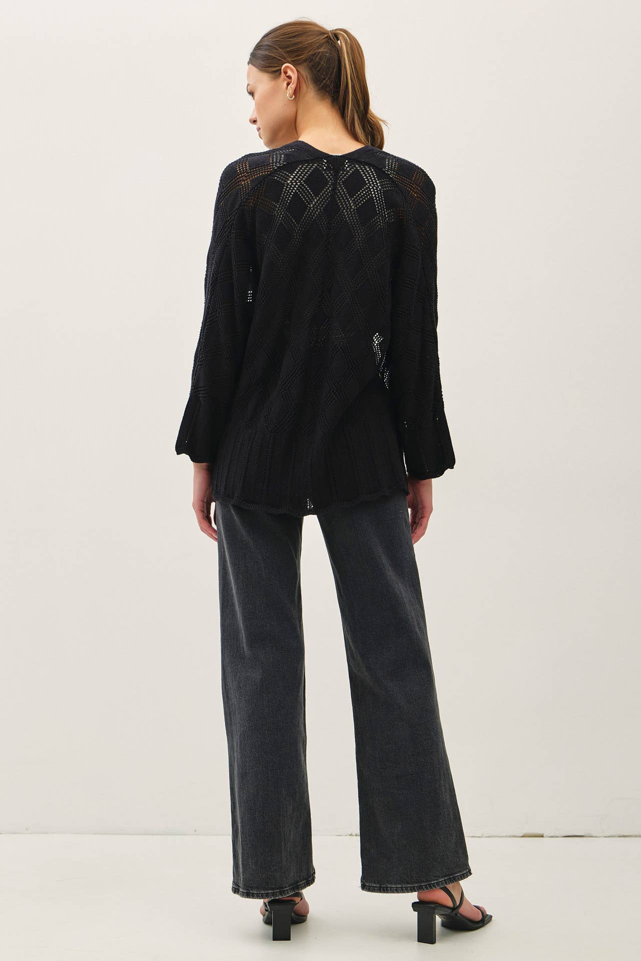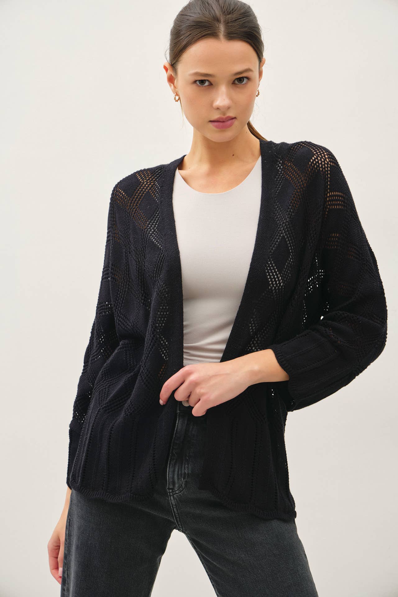 A true layering essential, the Coastal Breeze Crochet Cardigan brings effortless elegance to every outfit. Designed in a lightweight open-knit crochet with dolman sleeves and a beautifully scalloped hem, this airy black cardigan adds the perfect touch of texture and movement. Whether you're slipping it over one of our breezy dresses, chic pant sets, or relaxed jumpsuits, it offers just the right amount of coverage while keeping you cool and comfortable. A must-have for sunset strolls, beachside dinners, or anywhere your coastal adventures take you
