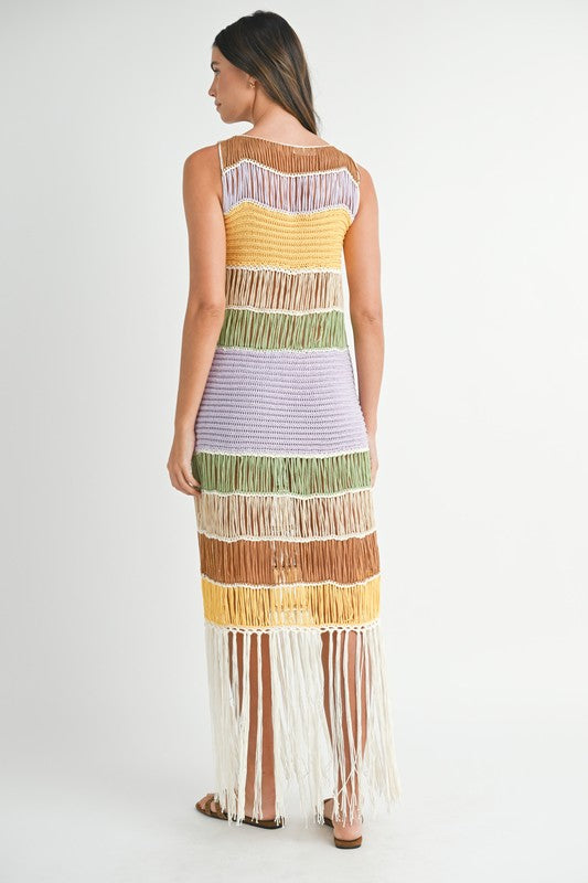 Turn every head in the Coastal Muse Fringe Maxi Dress — a breathtaking, showstopping piece that captures the essence of effortless seaside glamour. This sleeveless crochet knit stunner features a mesmerizing mix of sun-washed tones, flowing into dramatic fringe that sways with every step. With a sheer silhouette that exudes confidence and coastal cool, this maxi dress is perfect for beachside soirées, resort escapes, or anytime you want to steal the spotlight. Bold, bohemian, and unforgettable.