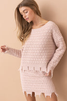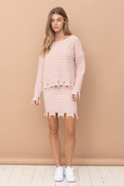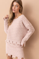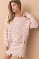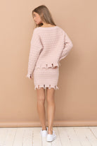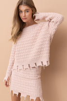 ozy meets coastal in the Blush Tides Cable Knit Set—a dreamy two-piece that’s as effortlessly stylish as it is comfortable. Designed in a soft, coastal light pink, this oversized distressed cable knit sweater pairs perfectly with the coordinating mini skirt for a look that feels relaxed, elevated, and ready for seaside moments year-round.
