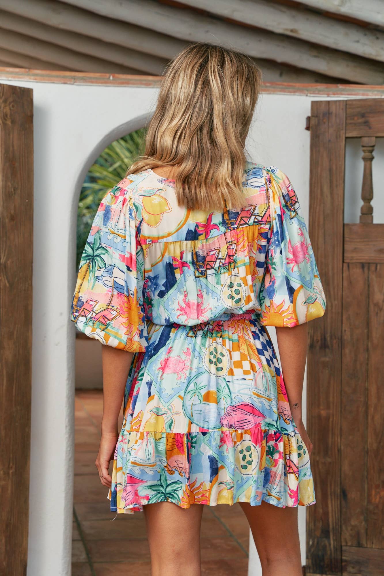 Escape to paradise in our Santa Maria Tropical Breeze Mini Dress. This floaty, feminine silhouette features a relaxed-fit bodice and a vibrant island-inspired print, perfectly bordered at the hem for a bold coastal finish. The layered front skirt adds playful movement, while balloon sleeves with elastic cuffs and delicate frill details bring a touch of romance. With a flattering elastic waist and tie detail, sheer shoulder accents, and a flirty frilled hem, this mini dress is your go-to for sun-soaked days and breezy nights. A true coastal charmer.