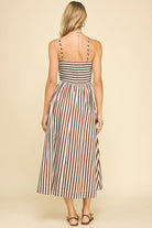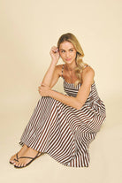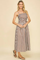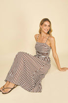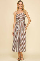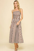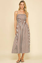 Timeless, effortless, and endlessly versatile, the Coastal Stripes Midi Dress is your year-round go-to for polished coastal style. Featuring elegant milk chocolate and white stripes, this flattering midi dress offers adjustable straps, delicate tucked detailing, and smocking at the back for a comfortable, tailored fit. Wear it solo with sandals for a breezy beach day, or layer it with a denim jacket and boots as the seasons shift. Whether you're oceanside or out for a sunset dinner, this dress captures the laid-back elegance of coastal living with a modern, elevated touch.