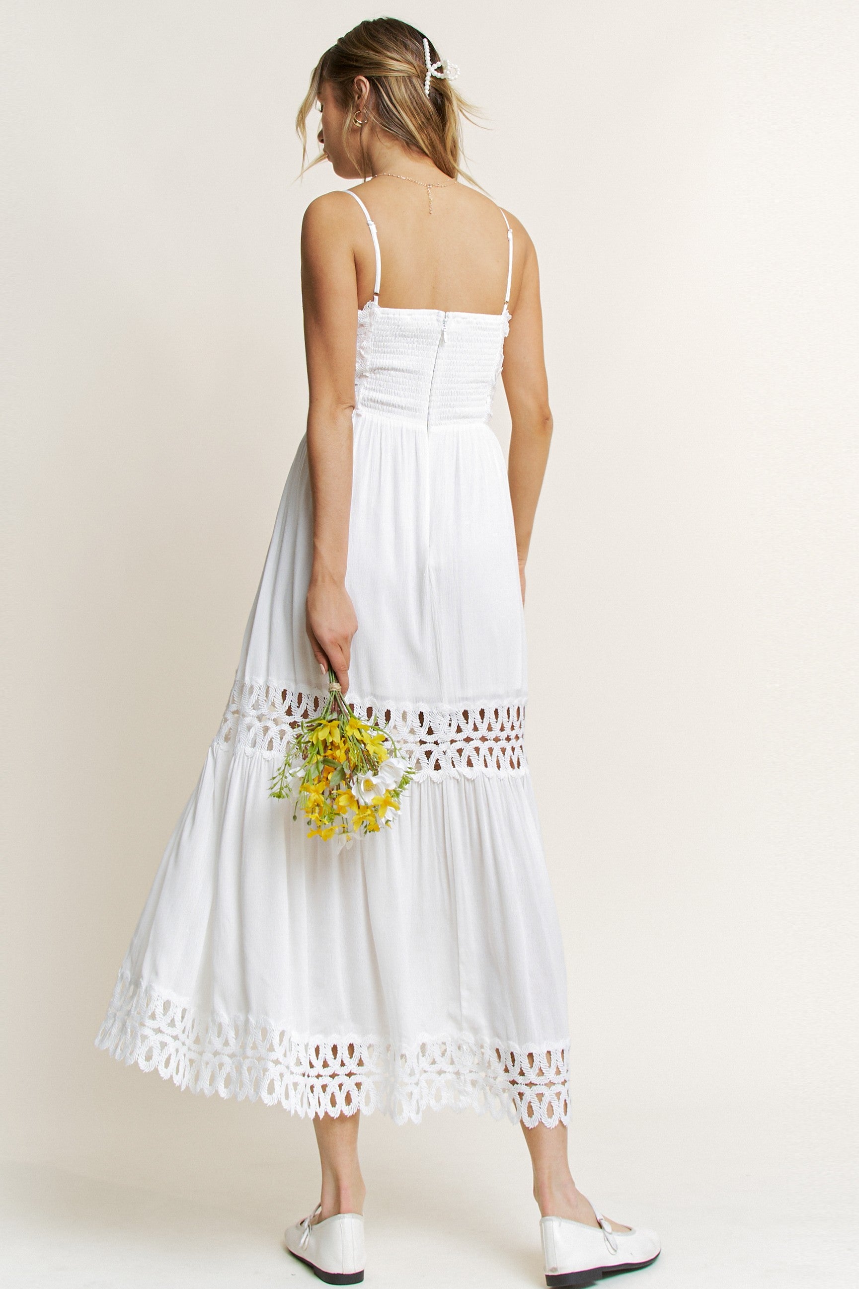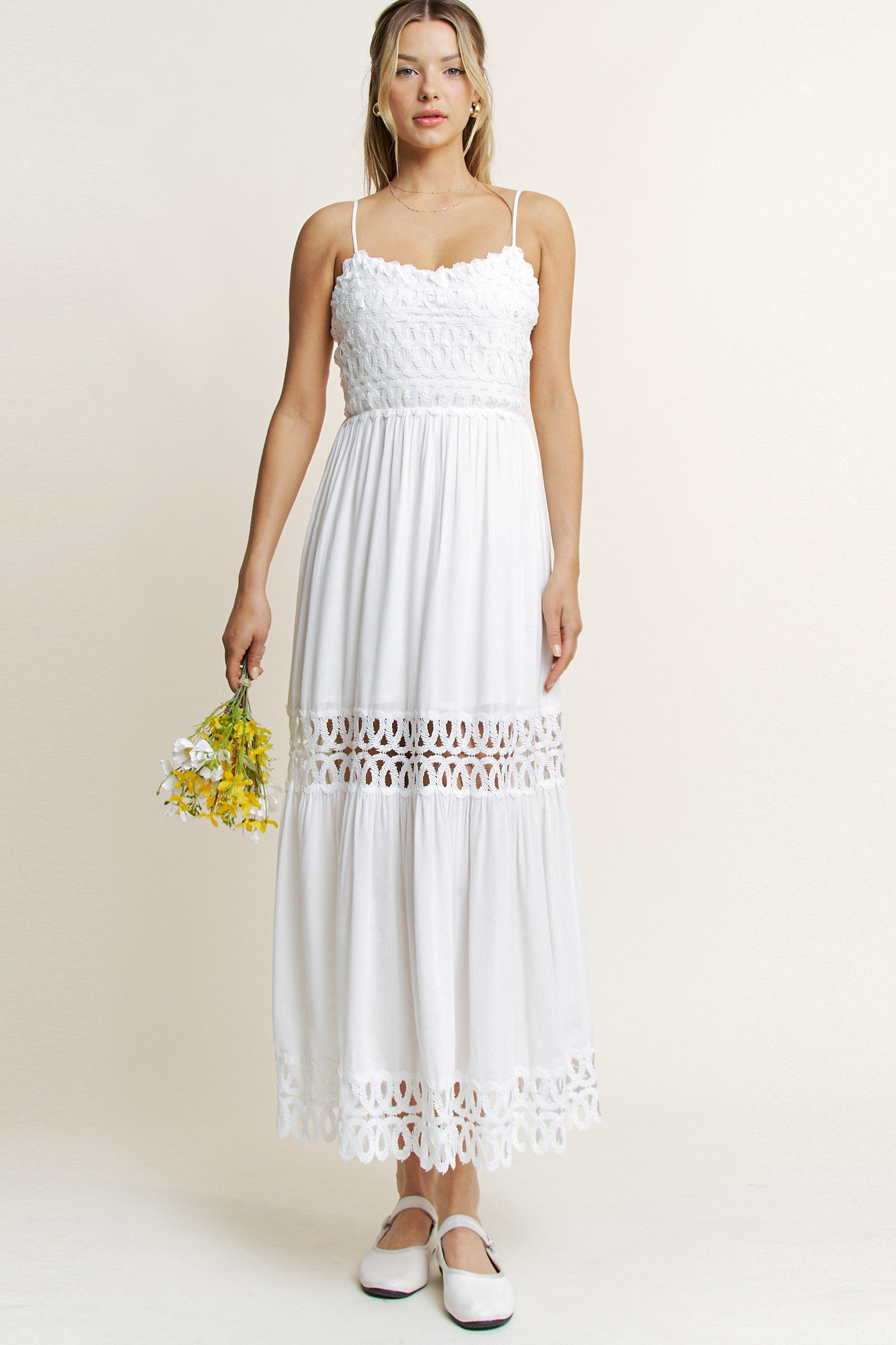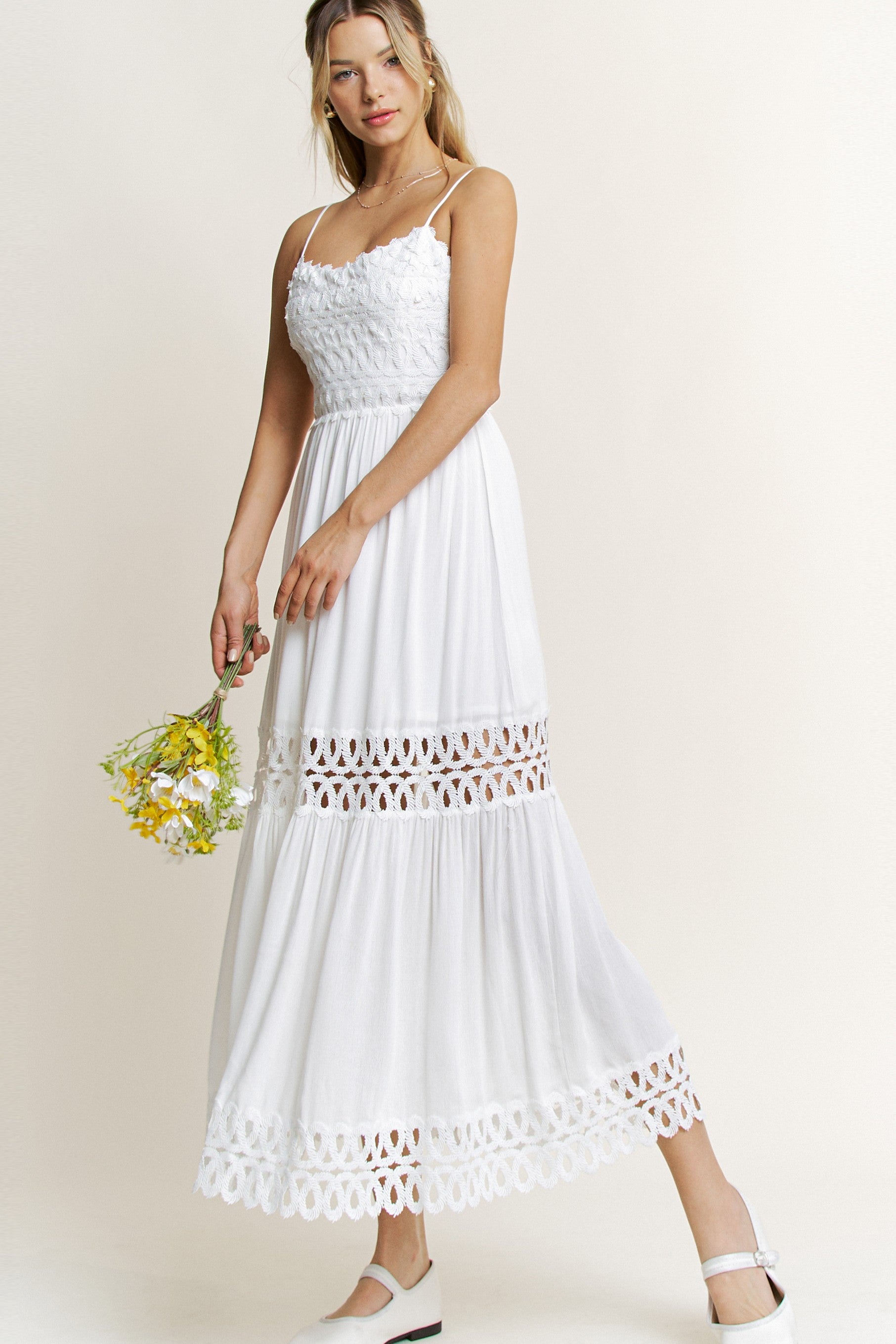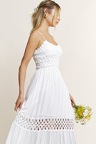 Ethereal and ocean-kissed, the Shoreline Grace Crochet Maxi Dress is a coastal dream come to life. Crafted in stunning white crochet lace, this woven maxi flows with timeless elegance and breezy sophistication. Featuring adjustable shoulder straps, a smocked back panel for a flexible fit, and a hidden back zipper for a seamless finish, it’s designed to flatter and float effortlessly. Perfect for seaside photoshoots, barefoot beach weddings, or romantic shoreline strolls, this dress is a breathtaking beauty that captures the magic of the coast.